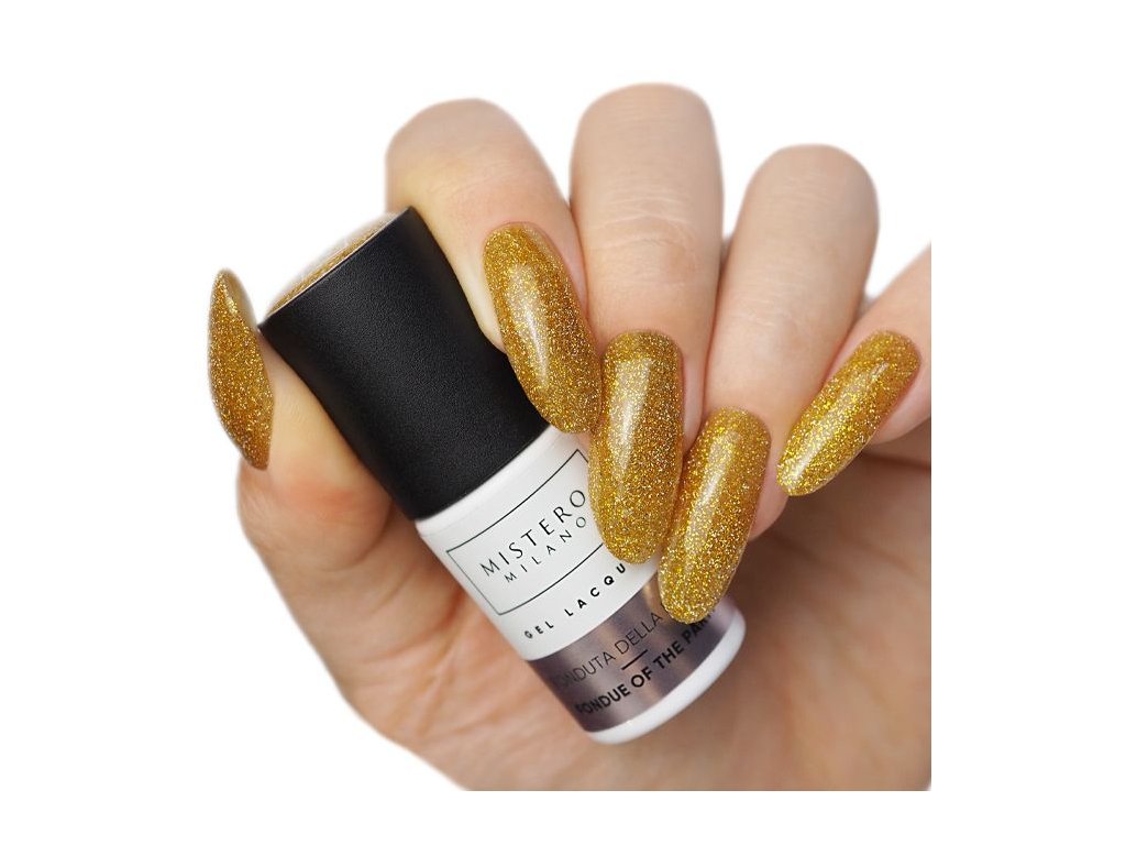 Zlatý gel lak můžete s klidem použít v smyslné solo verzi, nebo ho zkombinovat s jinými odstíny klasických gel laků. Použijte ho jako základ pro tvorbu sofistikovaných večírkových dekorací a ciťte se jako skutečná hvězda červeného koberce, osvětlená tisíci reflektorů.